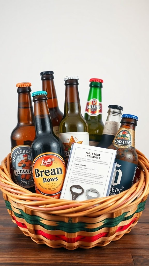 When thinking of adult Easter basket ideas, a craft beer sampler is a fun and unique twist. The image shows an inviting basket filled with various craft beer bottles, perfect for those who appreciate a good brew. This idea adds a touch of sophistication and enjoyment to the traditional Easter basket theme.