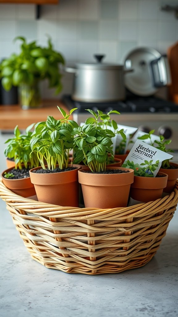 Imagine a beautiful wicker basket filled with small pots of fresh herbs like basil, mint, and rosemary. Each pot is ready to be nurtured on a kitchen windowsill or patio. It’s a thoughtful gift for anyone who enjoys cooking or wants to add a green touch to their home.