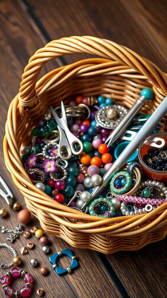 The image showcases a vibrant basket filled with colorful beads, charms, and crafting tools. It’s an inspiring sight that can spark ideas for creating beautiful, personalized jewelry pieces. Whether it’s making a necklace for a friend or crafting earrings for yourself, the possibilities are endless.