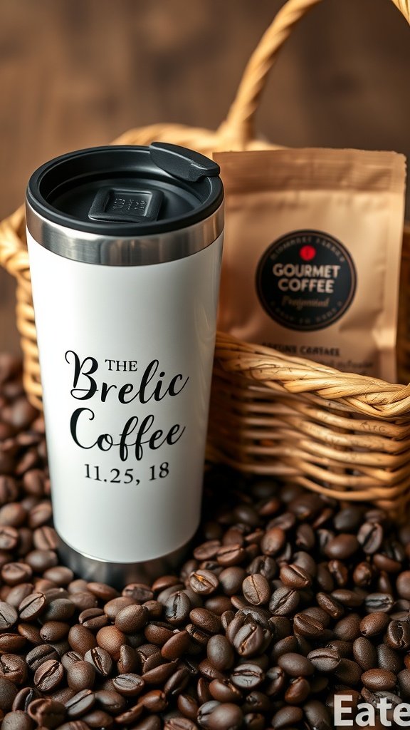 Pair the travel mug with gourmet coffee or tea for a delightful experience. The image shows a sleek white mug next to a package of gourmet coffee, hinting at the perfect combination. This pairing is not only practical but also encourages relaxation and enjoyment, making it one of the unique Easter basket ideas to consider for friends and family.