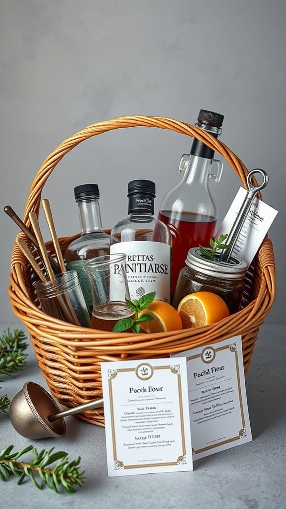 The image showcases a beautifully arranged basket filled with essential cocktail-making supplies. You’ll find various bottles, including spirits and mixers, alongside fresh ingredients like oranges and herbs. The inclusion of cocktail recipes on cards makes it easy for the recipient to whip up delicious drinks.