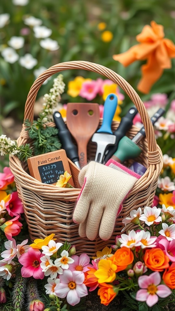 The vibrant flowers surrounding the basket highlight the joy of gardening. Add in some seeds for flowers or herbs, and you’ve created a lovely starter kit for someone eager to grow their own garden. This is not just a gift; it’s an invitation to explore and enjoy nature.