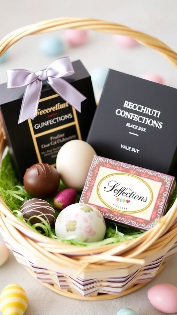 When thinking of adult Easter basket ideas, a gourmet chocolate selection can be a delightful surprise. Imagine a beautiful basket filled with rich, artisanal chocolates, all creatively shaped like Easter eggs, bunnies, and flowers. The picture showcases a lovely arrangement, with chocolates in a variety of colors and designs that instantly catch the eye.