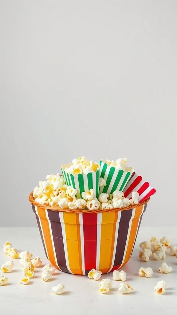 The image shows a vibrant striped basket overflowing with popcorn, accompanied by little paper cups. These cups can be filled with different flavors, making it easy for everyone to enjoy their favorites. Think spicy jalapeño, sweet caramel, or even cheesy cheddar!