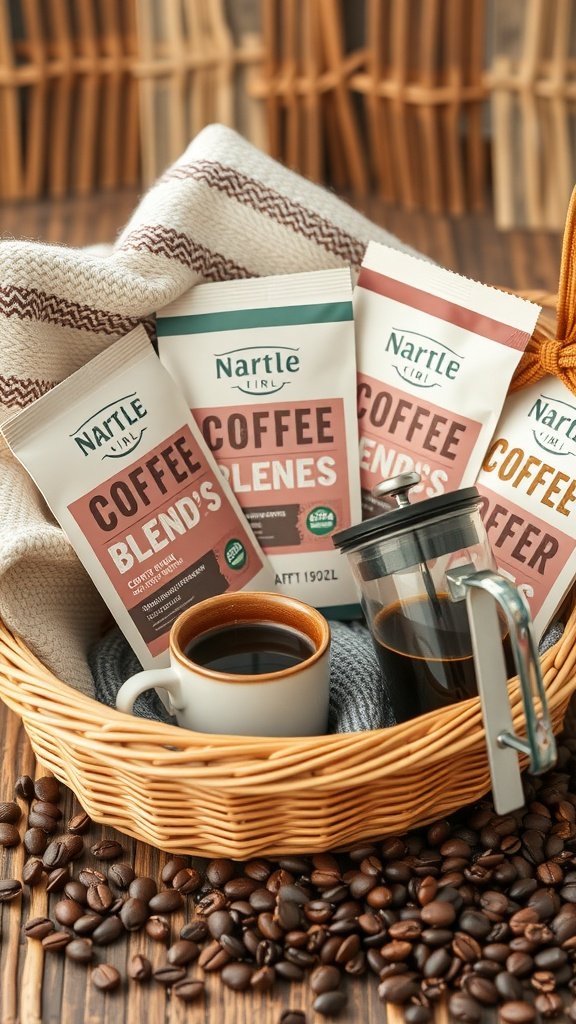 When thinking about unique Easter basket ideas for adults, consider a personalized coffee blend. Imagine the joy of gifting a basket filled with custom coffee that speaks to the recipient’s taste. The image showcases a cozy basket, adorned with various bags of coffee blends, a stylish coffee cup, and a French press, making it a delightful centerpiece for any Easter celebration.