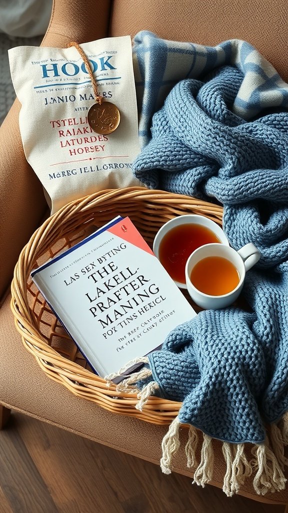 Start with a cute basket, like the one in the image, which holds all the essentials. Include a warm, soft blanket that invites snuggling up with a good book. You can pick one in soothing colors to match any decor.