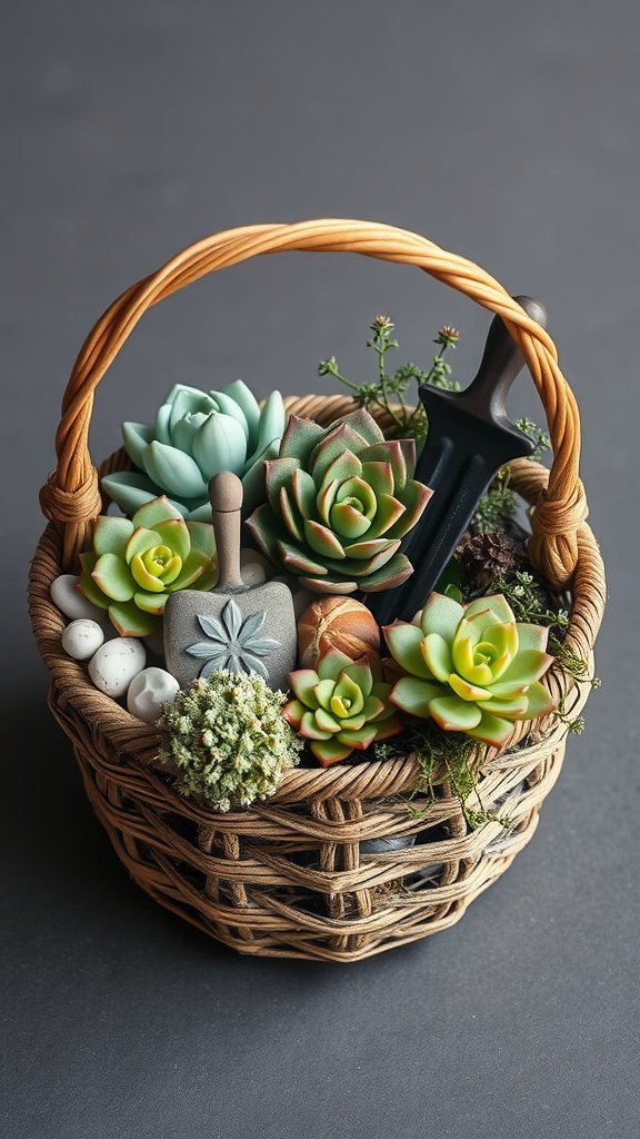 In the image, you can see a charming basket filled with a variety of succulents. The mix of colors and shapes creates a visually appealing arrangement. Alongside the plants, small gardening tools hint at the joy of nurturing these green beauties. This makes for a thoughtful addition to any adult Easter basket ideas.