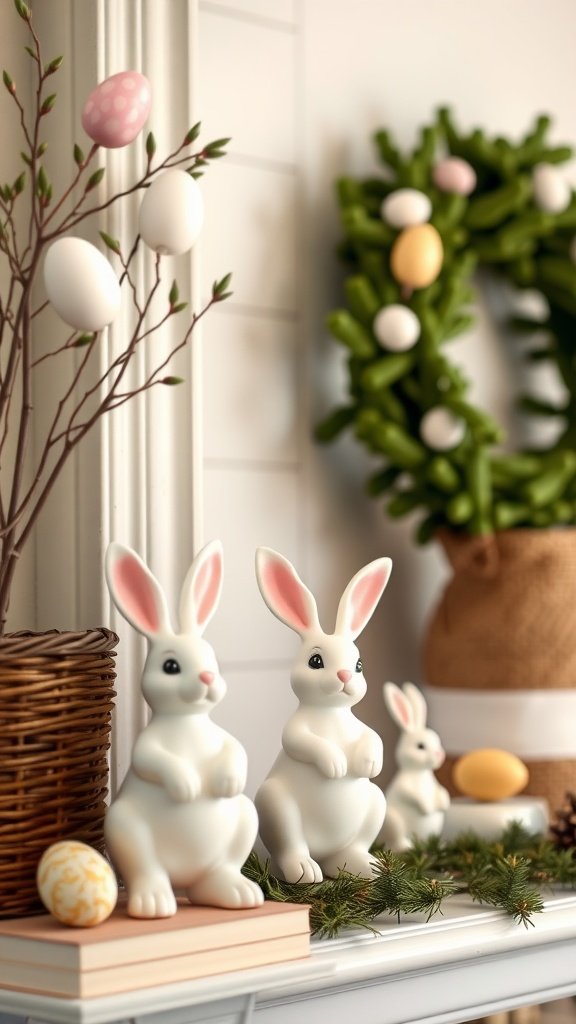In the image, you can see a lovely display of white bunny figurines sitting proudly on a shelf. The bunnies have sweet expressions and floppy ears that capture the spirit of Easter. They are surrounded by colorful eggs and greenery, creating a warm and inviting scene. This setup not only brings joy but also enhances your festive decor.