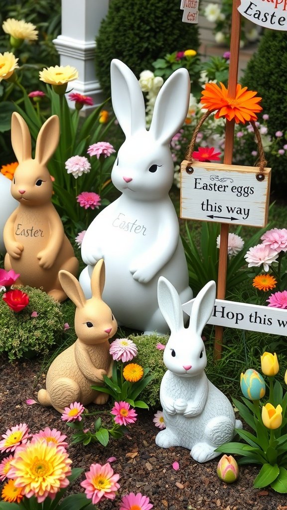 Bunny-themed garden decor brings a cheerful vibe to your outdoor space during Easter. In the image, you see a lively arrangement of cute bunny figurines nestled among colorful flowers. These playful bunnies, dressed in their little bows and surrounded by vibrant blooms, create a welcoming atmosphere that is perfect for celebrating the season.