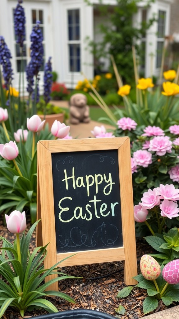 Chalkboard signs bring a charming touch to your Easter decor. This festive display features a simple, yet inviting message: ‘happy Easter.’ Such signs can be used in various settings, from your garden to your dining table, adding a personal and cheerful vibe to your celebration.