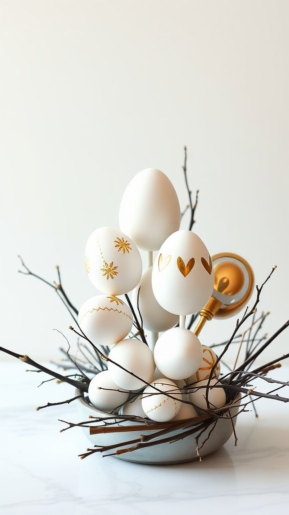 When it comes to Easter decor, a chic minimalist egg display can really elevate your space. The image features an elegant arrangement of white and gold eggs, creating a serene and sophisticated look.
