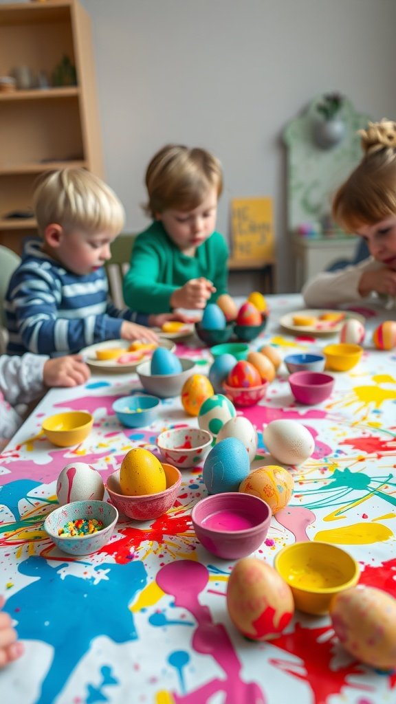 Decorating Easter eggs can be a delightful activity for kids. This image captures children happily engaged in coloring and decorating their eggs with various paints and embellishments. It’s a wonderful way for kids to express their creativity and enjoy some time together.