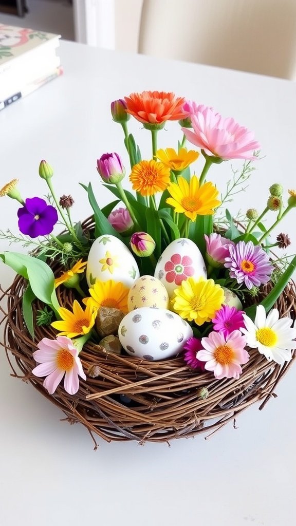 Using eggs in home decor is a fun way to celebrate Easter and add a touch of spring to your space. The image showcases a beautifully arranged nest filled with decorated eggs, vibrant flowers, and natural elements. It’s a delightful centerpiece that can brighten any room.
