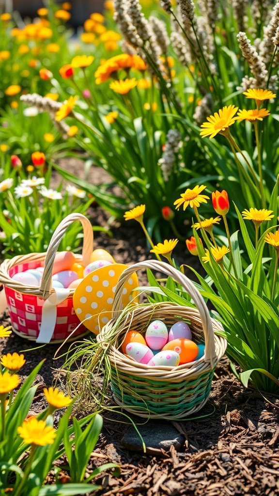 These decorations not only enhance the festive atmosphere but also make the hunt more exciting for children and adults alike. The mix of vibrant flowers in the background complements the decorations and creates a joyful setting.