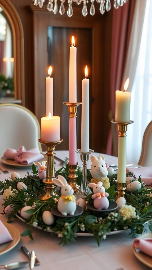 Easter is a time for warmth and celebration, and what better way to set the mood than with lovely candle arrangements? In the image, you see a beautiful display of pastel-colored candles surrounded by a soft, natural green garland. The flickering flames create a cozy atmosphere, perfect for gathering with loved ones.