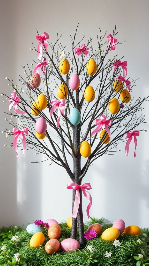 The image showcases a beautifully arranged Easter egg tree, complete with vibrant eggs and playful ribbons. The tree itself is minimalistic, with bare branches adorned with colorful eggs in shades of yellow, pink, and blue. The pink ribbons add a lovely touch, giving the tree a festive feel. Surrounding the base, a soft green moss bed and bright flowers enhance this cheerful display.