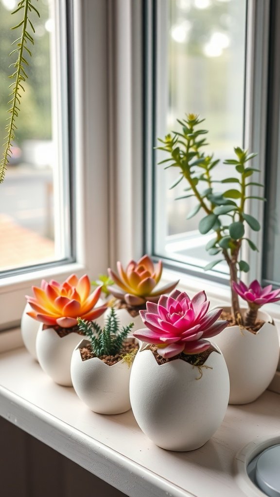 In the image, you can see a collection of succulent plants nestled in what looks like eggshells. The soft white of the planters contrasts beautifully with the vibrant colors of the succulents. This arrangement adds a playful vibe to any window sill or table.