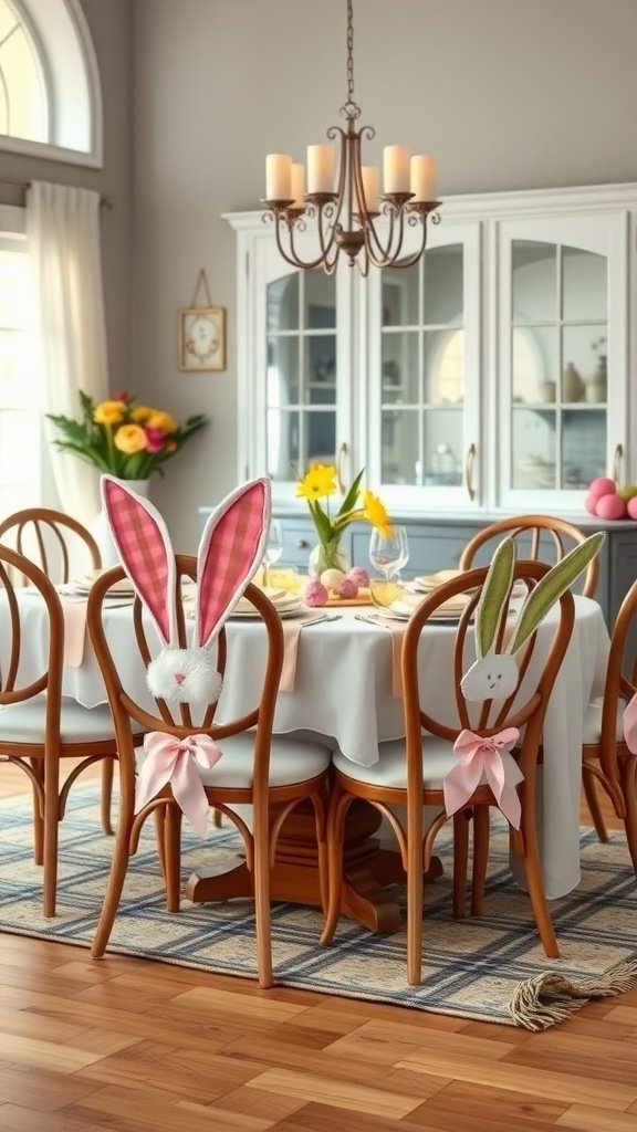 Imagine a cheerful dining room filled with the spirit of Easter. The long table is beautifully set, and each chair is adorned with charming bunny ears that bring joy and a festive atmosphere. This simple decoration can make your meal feel special and festive, creating lasting memories.