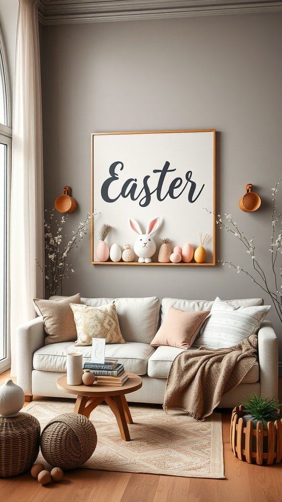 Surrounding the sign are delightful decorative elements, including pastel-colored eggs and an adorable bunny figure. These additions give a playful vibe that is perfect for celebrating this joyful season. The neutral tones of the furniture and decor balance out the bright colors, creating a harmonious atmosphere.