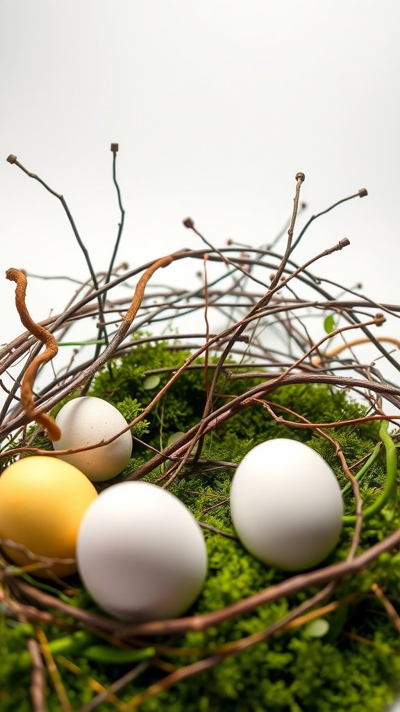 The eggs, with their soft colors, add a touch of warmth and symbolize new life, which is perfect for the season. The twigs create a rustic look, while the moss provides a lush green backdrop, making it all come together beautifully.