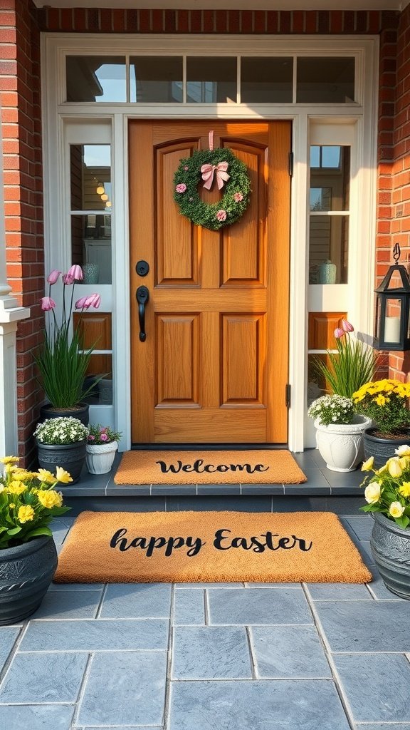 Spring is a time for renewal, and what better way to embrace the season than with cheerful door mats? In the image, we see a lovely setup featuring two door mats that warmly greet visitors. The mat saying ‘Welcome’ is a friendly touch, while the one that reads ‘happy Easter’ adds a festive flair. Together, they create an inviting atmosphere perfect for the spring holiday.