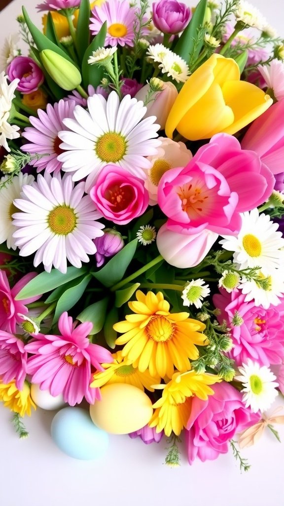 Spring is here, and with it comes the joy of fresh blooms and vibrant colors. A delightful way to celebrate Easter is by creating beautiful flower bouquets. The image showcases a lovely arrangement filled with various flowers and a few pastel eggs, adding that special Easter touch.