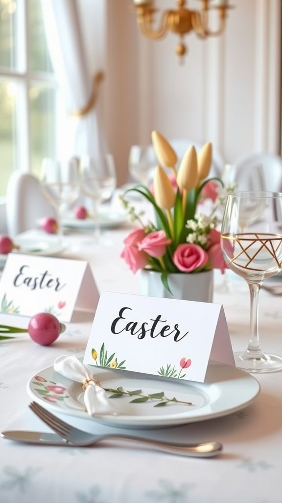 The image perfectly captures a charming Easter table setting. The white place cards, elegantly printed with the word ‘Easter,’ stand out against the soft colors of the floral arrangements and pastel eggs. The cards could also be personalized by adding your guest’s names to each card. Each card is placed beside a lovely plate, making the table feel inviting and festive.