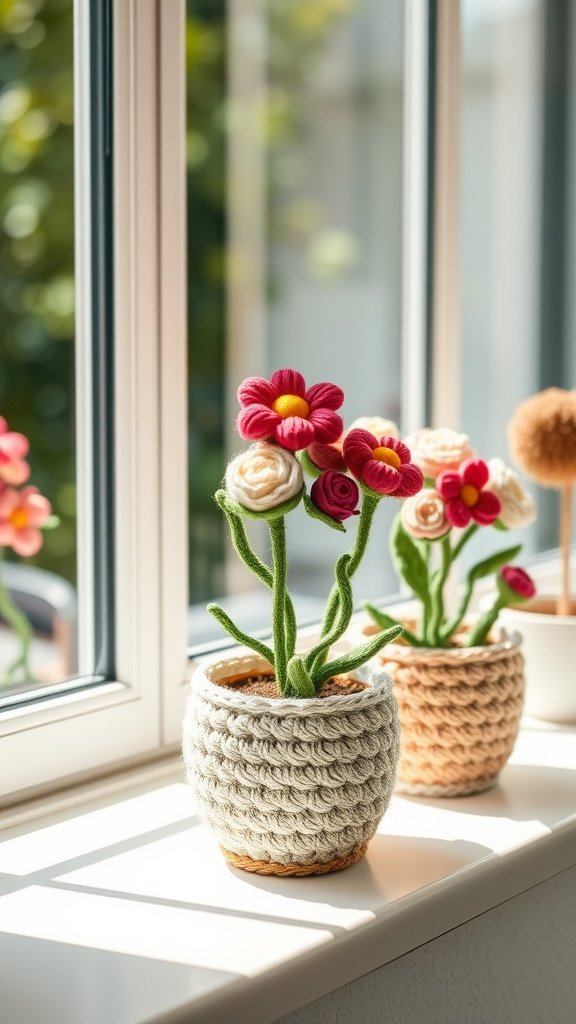 In the image, you can see beautifully crafted flower pots showcasing vibrant flowers. The pots are cozy and inviting, making them a delightful addition to your window sill or desk. Using simple crochet techniques, you can replicate this charming project.