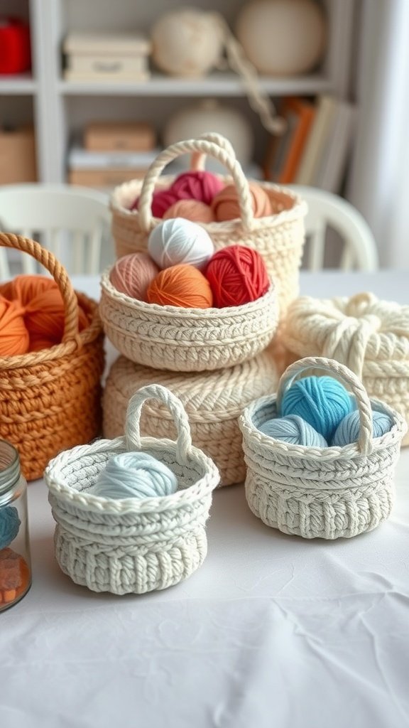 In the image, you see a variety of crochet baskets in different sizes and colors. Each basket is uniquely styled, showcasing the beautiful textures and stitches that crochet can offer. The soft yarns peeking out from the baskets add a delightful touch of color to the scene.