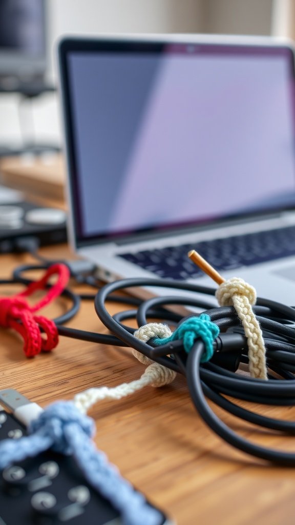 In the image, we see colorful crochet cable ties neatly holding together various cables next to a laptop. This shows how easy crochet can transform your everyday items into something functional and stylish.