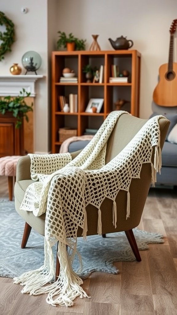 In the world of easy crochet projects, quick crochet shawls stand out for their simplicity and charm. The image showcases a cozy shawl draped over a stylish chair, inviting you to wrap yourself in its warmth. This particular design features an open stitch pattern, making it both lightweight and airy—perfect for layering!