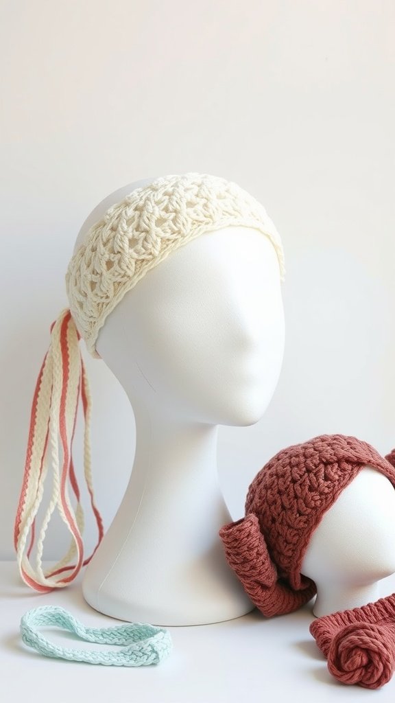 Crochet headbands are a fun way to express your style while keeping your hair in check. In the image, you can see a variety of headbands, each showcasing different textures and colors. The creamy headband has a lovely braided look, while the maroon one features a cute bow. The light blue one adds a pop of color and a bit of flair. These pieces are not just fashionable; they are also easy crochet projects you can tackle in a short time.