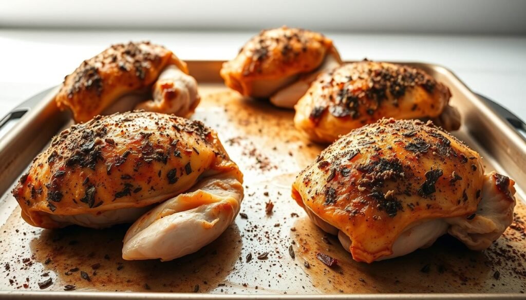Place the chicken thighs on a baking sheet, leaving enough space. This lets hot air move freely and helps the skin get crispy.