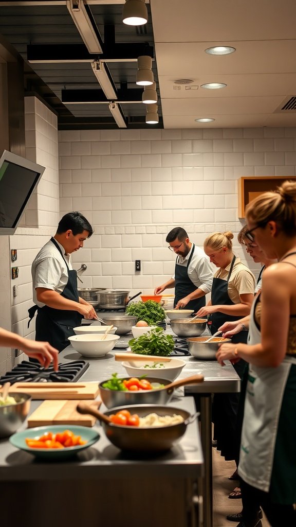 Giving the gift of a cooking class is a fun way to celebrate Mother’s Day. In the image, we see a vibrant kitchen filled with people who are engaged in cooking. Everyone is focused and ready to learn, which highlights the joy of sharing a meal together.