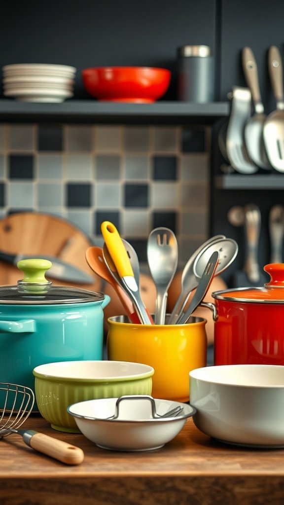A cooking utensil set makes for a fantastic Mother’s Day gift. It’s not just practical; it adds a splash of color and personality to any kitchen. The image showcases a vibrant assortment of pots, bowls, and utensils that any home chef would love to have.