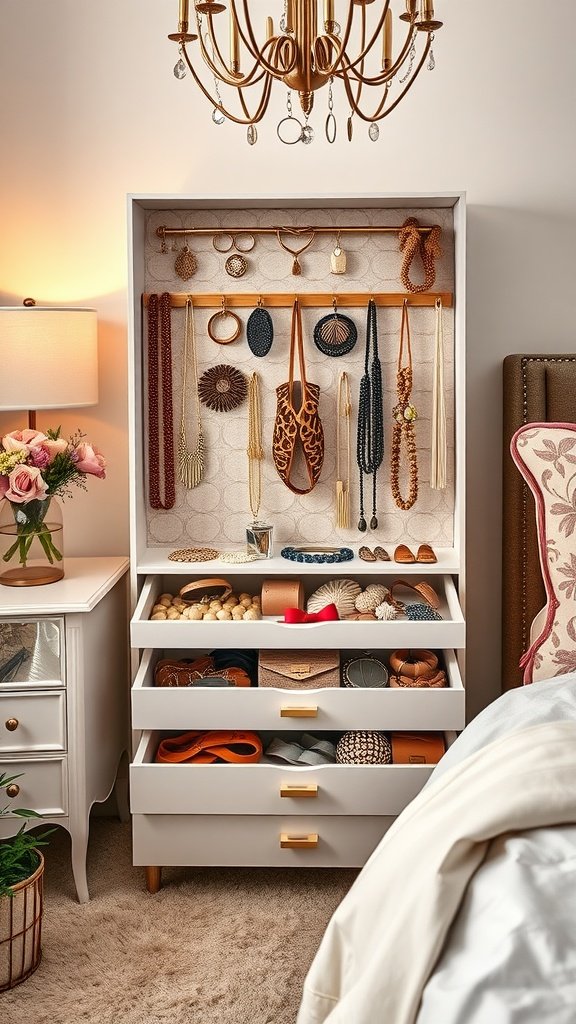 This image shows a beautifully designed organizer with various compartments. The hanging section is perfect for necklaces and earrings, while the drawers can hold bracelets, rings, and other small items. It’s ideal for moms who love accessorizing and want to keep everything organized and within reach.