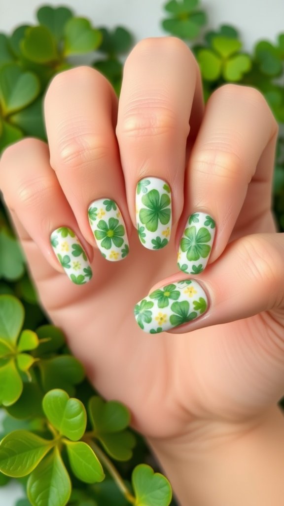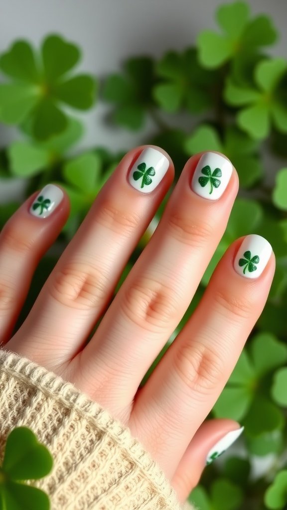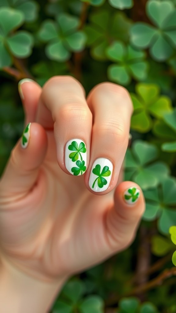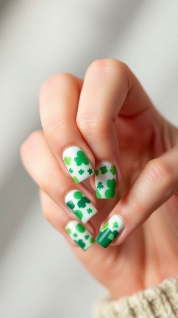 The nails showcase a variety of shamrock patterns and solid green accents. The white background helps the green pop, creating a fresh and lively look. This design is not only festive but also quite chic, making it suitable for both casual and more formal celebrations.