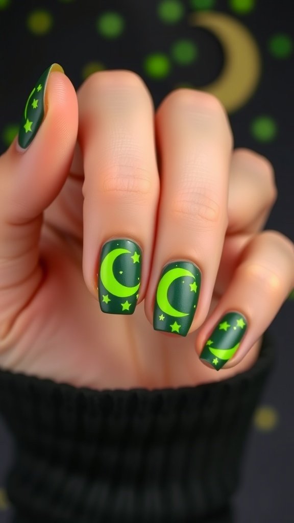 If you’re looking for some fun st patricks day nail ideas, why not try a bright green moon and stars design? This look combines a rich green base with bold yellow-green crescent moons and stars. It’s playful and catches the eye without being too overwhelming.