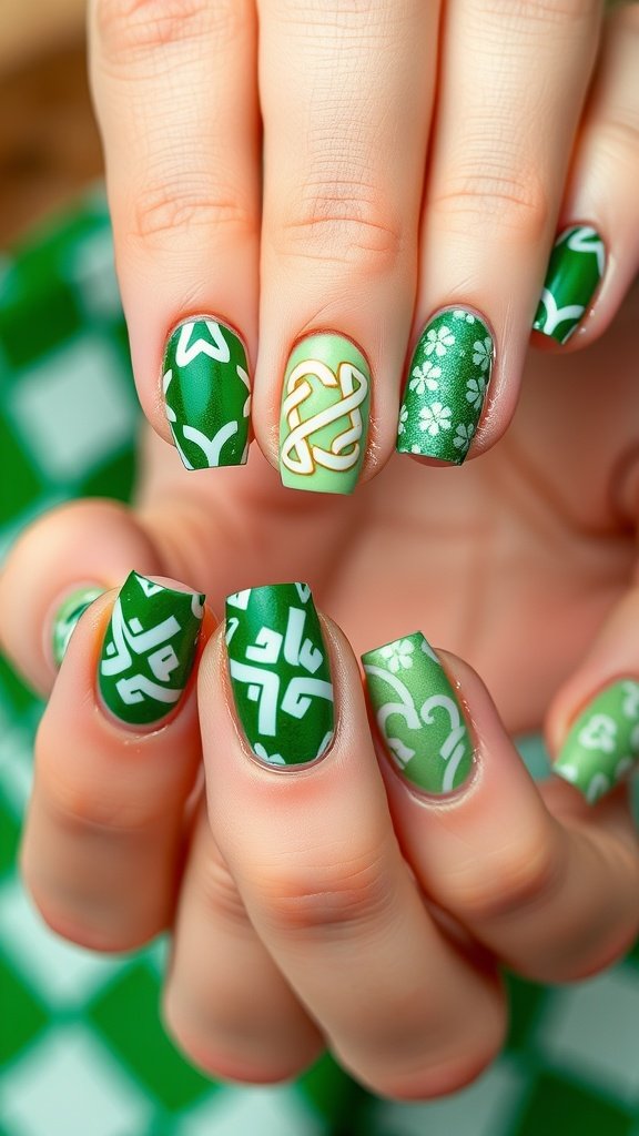 The image showcases a variety of green shades, emphasizing the traditional colors associated with this holiday. The use of different patterns, including a striking Celtic knot in the center, adds depth and uniqueness to the nail art. Each nail tells a story, blending tradition with modern style.