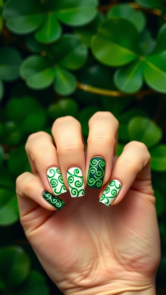The image showcases a beautiful hand with nails featuring a mix of deep green and white colors. Each nail is adorned with delicate spiral designs in varying shades of green, which contrast nicely with the solid dark green nails. This combination creates a harmonious look that perfectly embodies the spirit of St. Patrick’s Day.