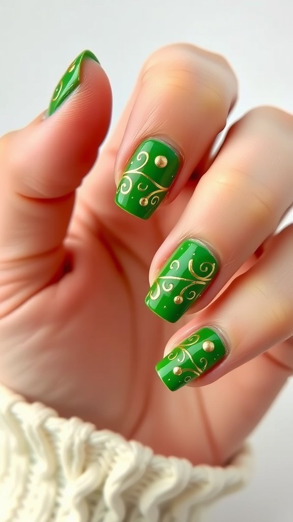 This nail design features a glossy green polish adorned with playful gold accents. The swirling patterns create a sense of movement, making your nails stand out beautifully. Whether you’re attending a party or just want to celebrate the holiday in style, these nails are sure to catch the eye.