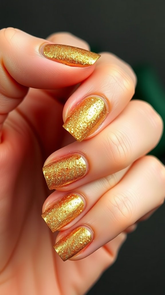 If you’re looking to add a touch of sparkle to your St. Patrick’s Day celebration, glittery gold nails are a fun choice! The image showcases beautiful gold glitter polish that shines brightly, making your nails a festive statement.