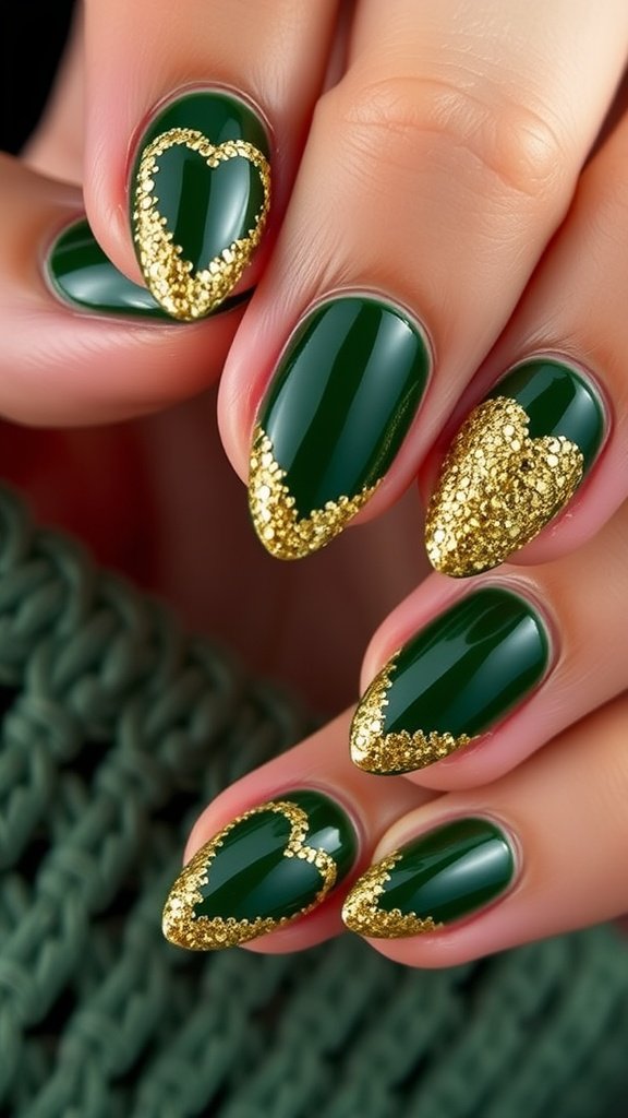 If you’re looking for festive st patricks day nail ideas, gold glitter heart tips are a fun choice! This design combines a rich green base with shimmering gold accents, creating a look that’s both chic and playful.