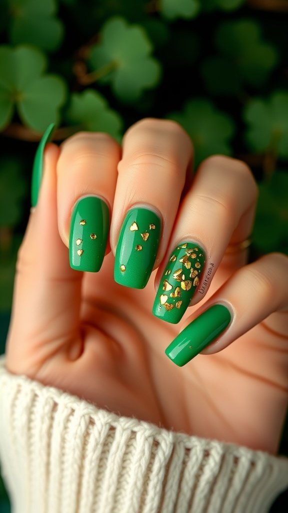 This nail design is a beautiful blend of rich green shades, perfect for celebrating St. Patrick’s Day. The ombre effect transitions smoothly from a darker green to a lighter tone, giving it a fresh and lively look. To add a touch of elegance, gold foil pieces are scattered across the nails, catching the light and creating a chic contrast against the green. This design not only embraces the holiday spirit but also showcases creativity and style, making it a fun choice for anyone looking for St. Patrick’s Day nail ideas.