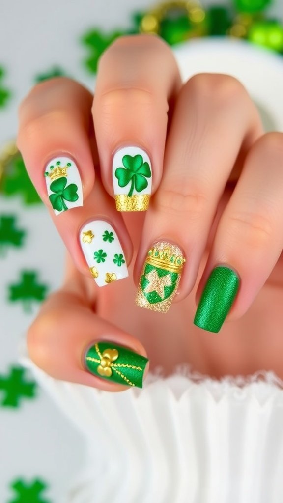 One nail features a charming four-leaf clover, a symbol of luck, while another showcases a golden crown. The use of different shades of green, alongside pops of white and glitter, adds depth and excitement to the overall look. Each design element works together to create a playful and cheerful vibe.