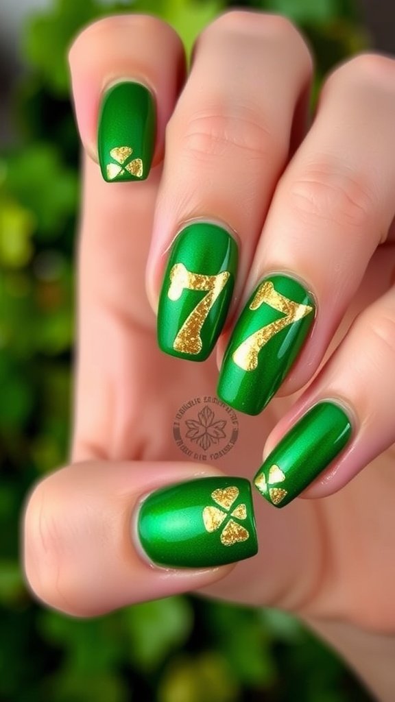When it comes to St. Patrick’s Day nail ideas, adding a touch of gold is a fun way to celebrate. This particular design features a rich green base, reminiscent of lush Irish landscapes, with charming gold coin accents that really pop.