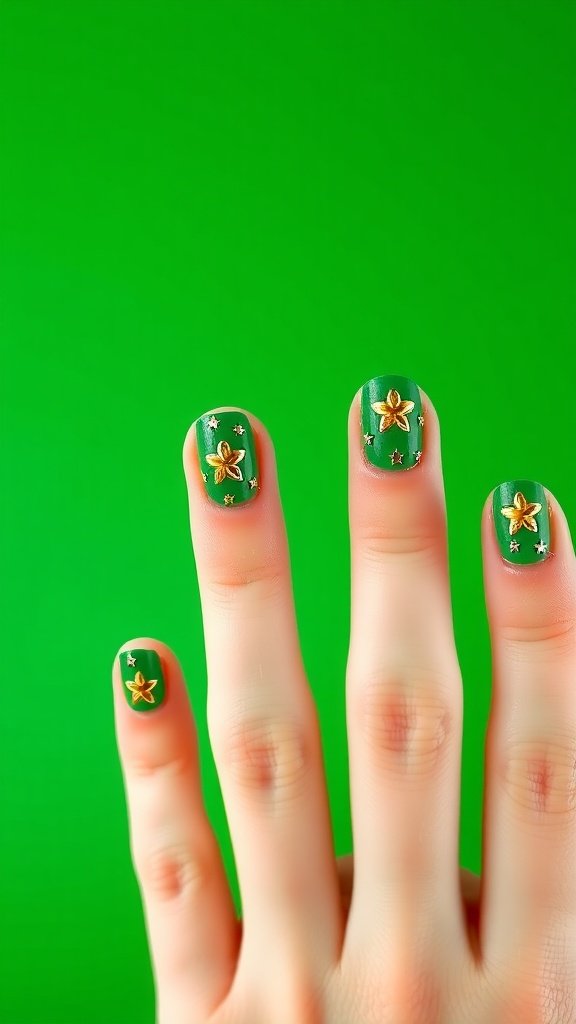 The standout feature of this design is the charming golden star embellishments. They add a touch of shimmer and a playful vibe, making your nails eye-catching. Pairing the gold stars with tiny white accents creates a lovely contrast against the green base.