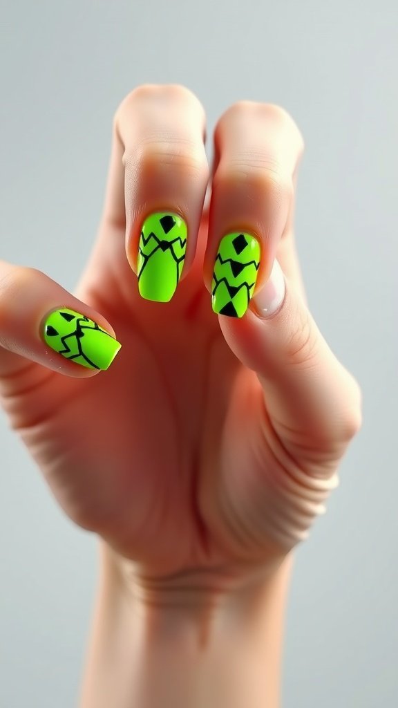 The image showcases nails painted in an eye-catching neon green, adorned with sharp black patterns. These geometric designs add a dash of creativity and flair, perfect for anyone looking to make a statement. The unique combination of colors is not only festive but also stylish, making it a great choice for parties or casual gatherings.