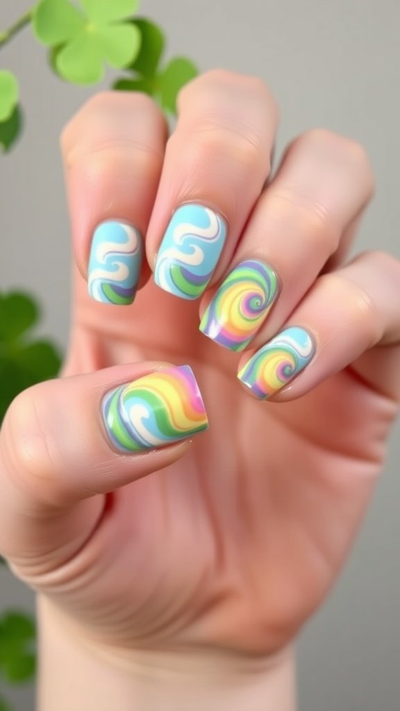 Pastel Rainbow Swirls are a delightful way to celebrate St. Patrick’s Day. This nail design features soft, swirling colors that bring a cheerful vibe to your look. The combination of pastel shades like light blue, pink, green, and yellow creates a fun yet subtle aesthetic.