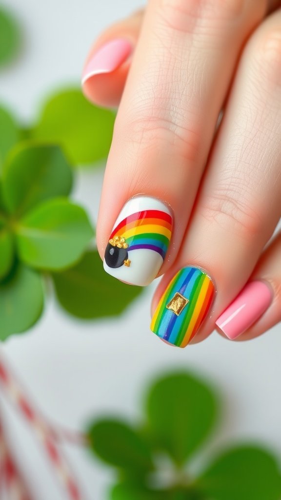The design often features classic rainbow stripes, which can be painted across the nails. You might also add a cute pot of gold, complete with shiny gold accents, to really capture the theme.
